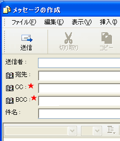 | ・メールを送るときには、「メールの作成」という操作をしますね。 このとき、あなたのメールアドレスは下記の画像の「送信者」というところに自動的に表示されています。 ・相手のメールアドレスは、通常、「宛先」というところに入力します。 それでは、CC、BCCという欄(図の★)はどんなときに使うのでしょうか?